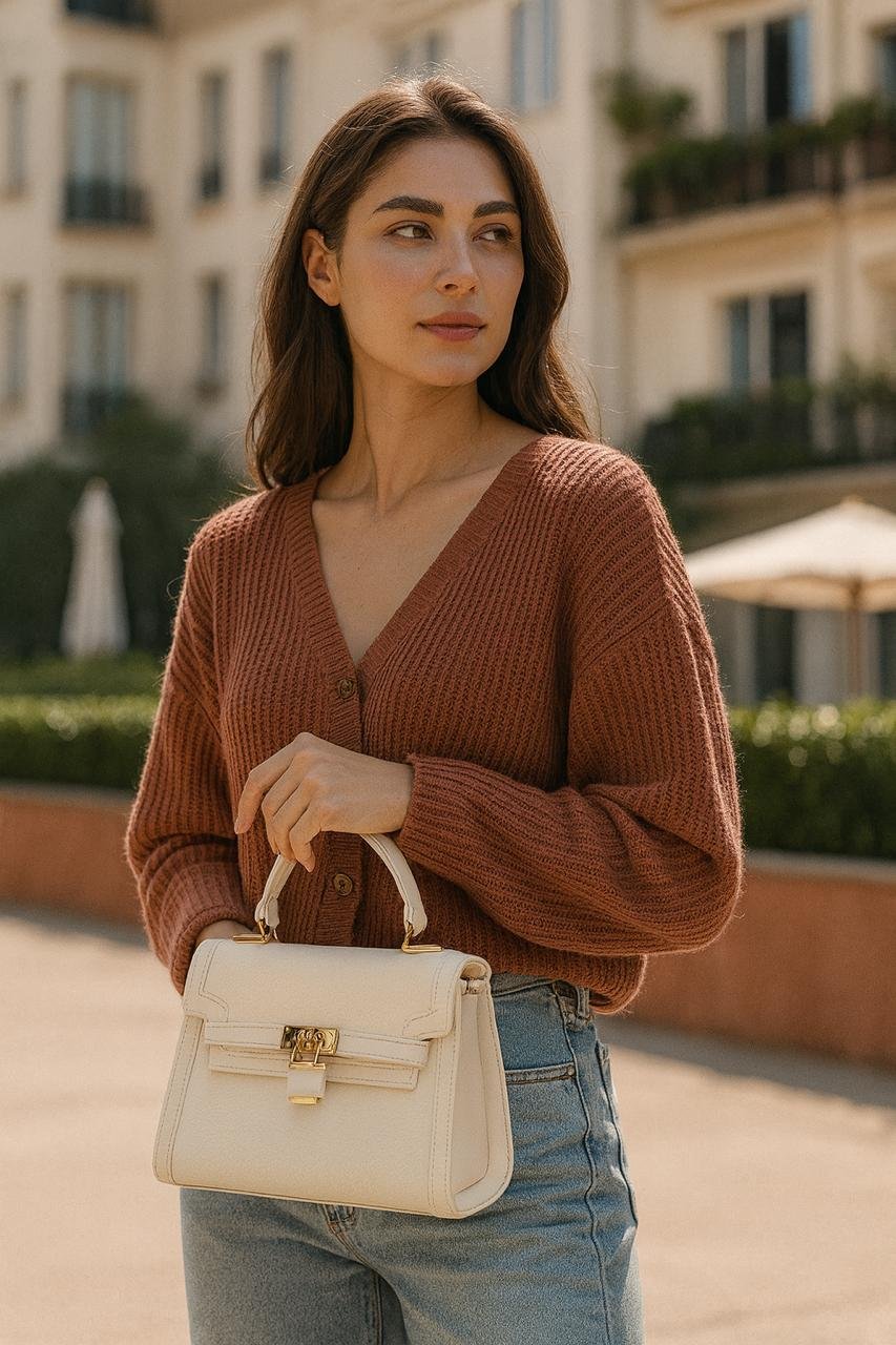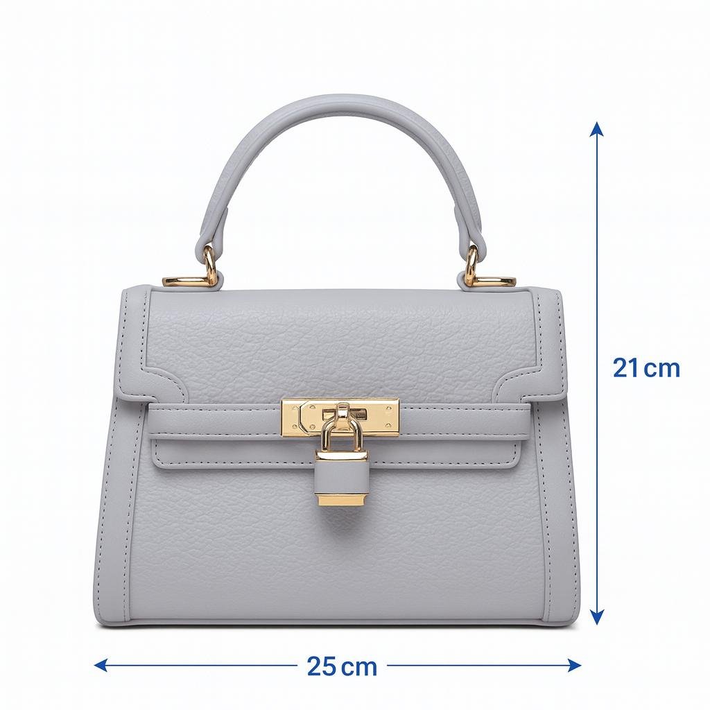 The Elegant Ladies Leather Handbag is the epitome of luxury and sophistication. Made from premium leather, this bag boasts a timeless structured design complemented by a striking gold-tone lock closure. Perfect for daily use or special occasions, it offers ample space for your essentials, making it as practical as it is fashionable. The gold hardware enhances the bag’s refined aesthetic, while the comfortable top handle ensures easy carrying. The elegant grey color pairs beautifully with any outfit, adding a touch of class to your wardrobe. Whether you’re heading to work or out for a night out, this bag will elevate your style effortlessly.